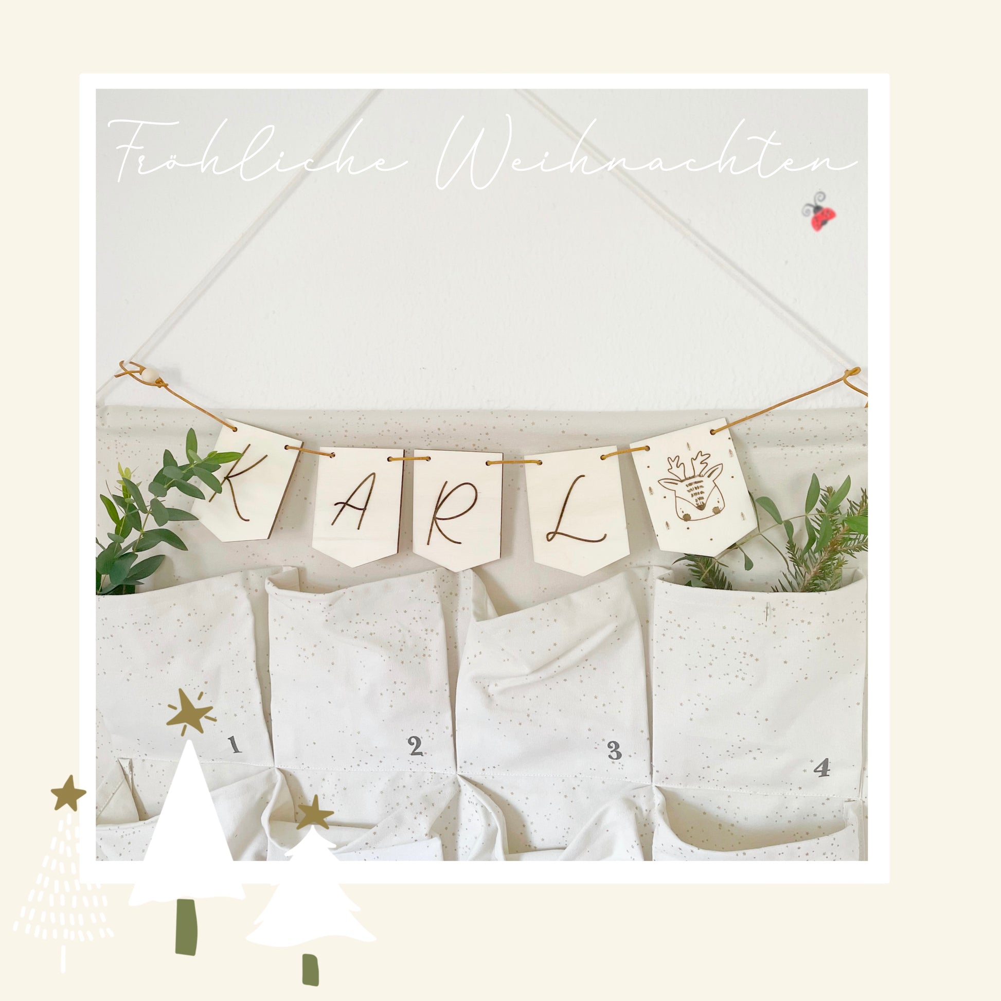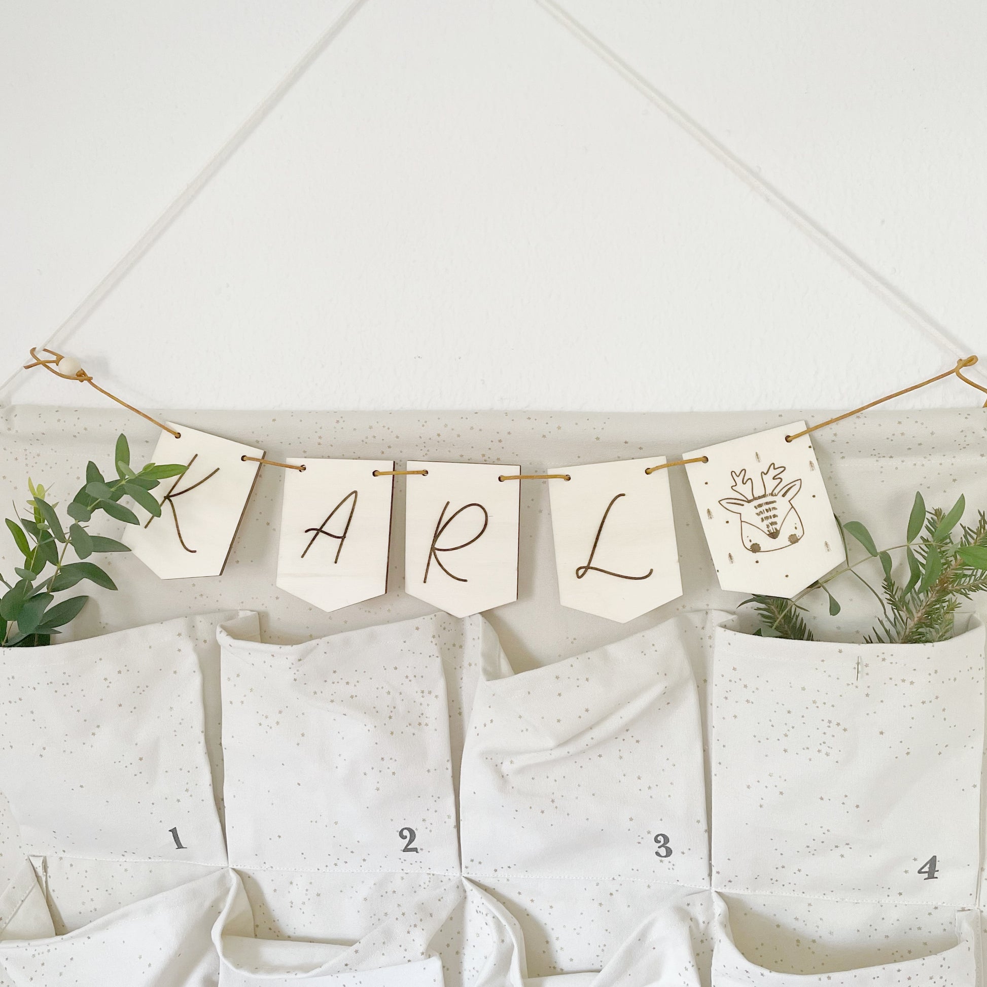 Verleihe deinem Zuhause oder deiner Feier eine persönliche Note mit unserer handgefertigten Wimpelkette aus Holz mit Namen und Wunschmotiv. Jede Wimpelkette wird individuell nach deinen Wünschen gestaltet und kann mit Namen und einem Motiv deiner Wahl versehen werden